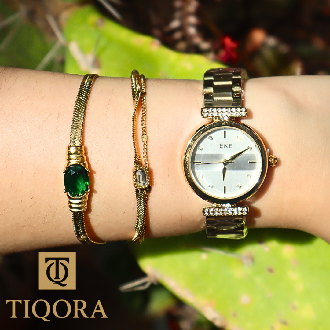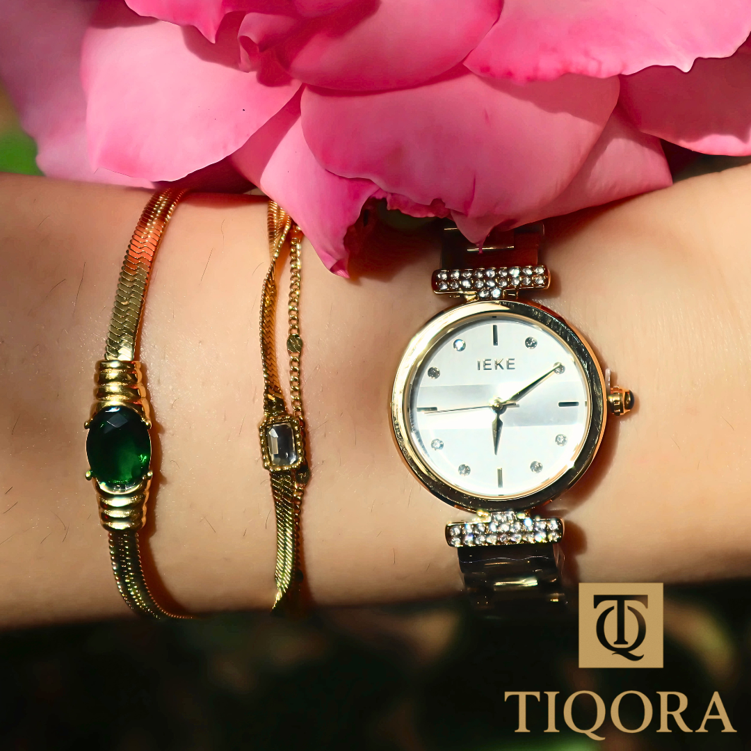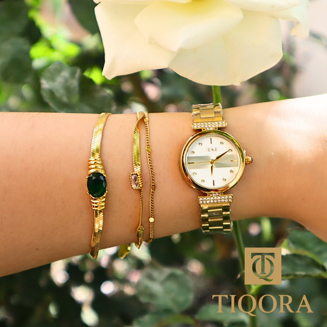 Le coffret IEKE Eliska est une véritable déclaration de style : une montre-bijou dorée, pensée pour sublimer chaque mouvement avec élégance. Son cadran doré brillant est encadré par deux barres de perles délicates qui relient subtilement le boîtier au bracelet en acier doré, ajoutant une touche précieuse et unique. ✨🌿