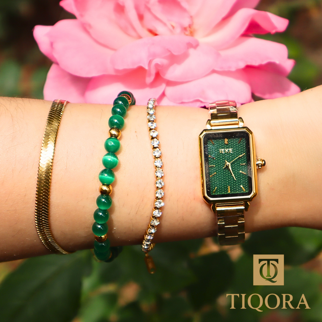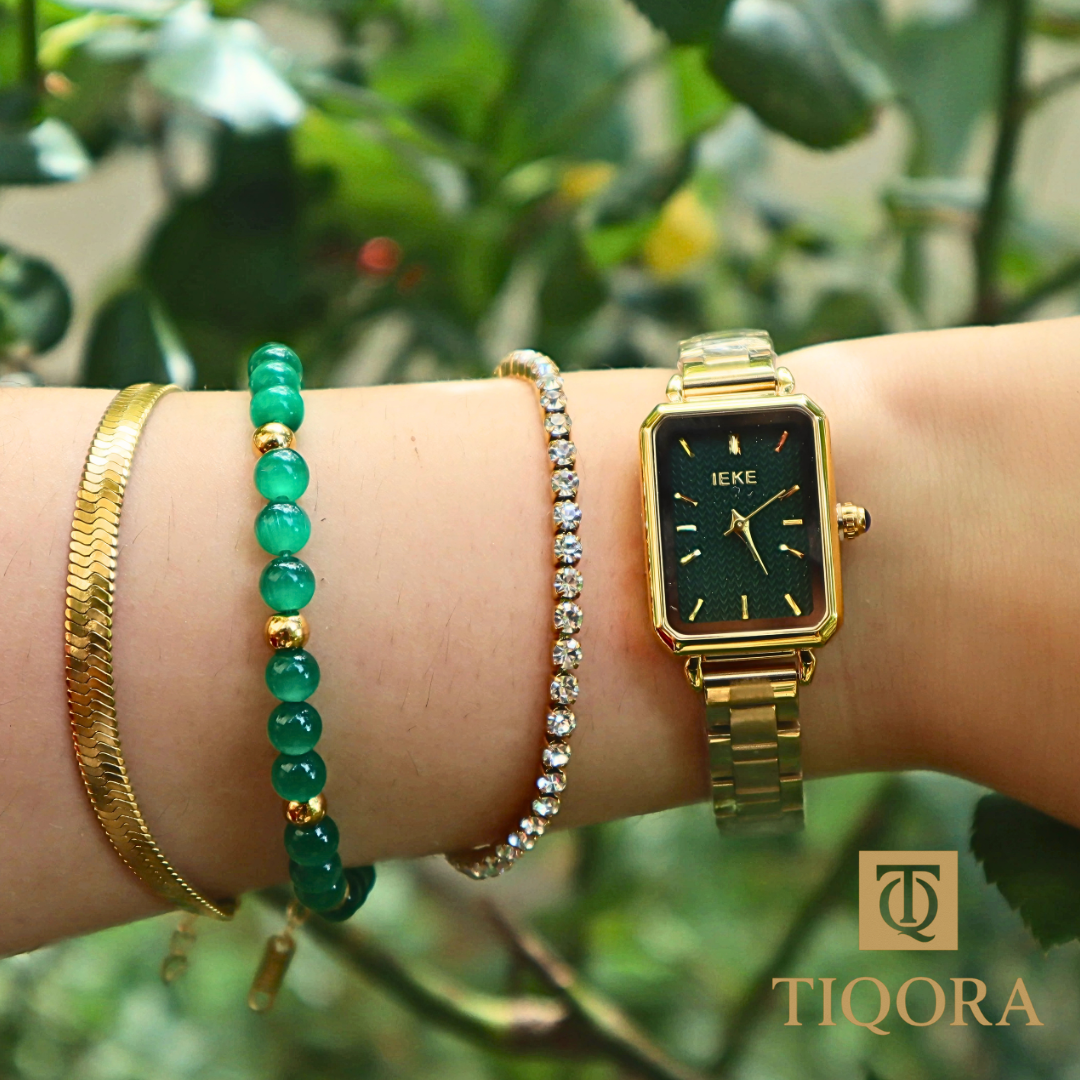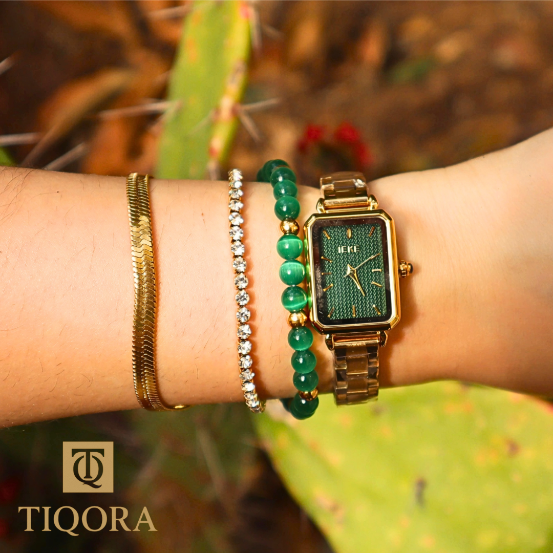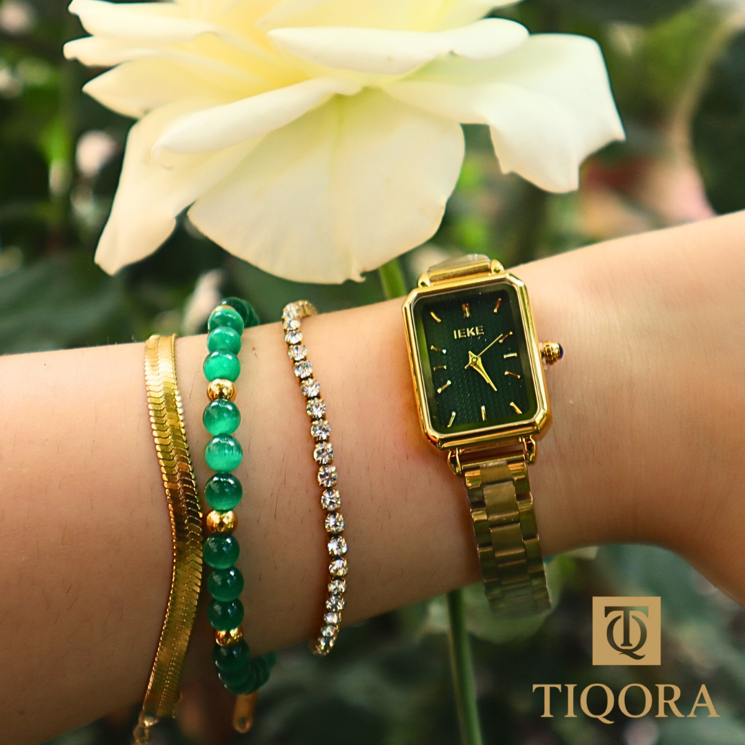 La montre dorée séduit par son cadran rectangulaire vert éclatant, intense et profond, contrastant joliment avec son boîtier et son bracelet en acier inoxydable doré. Un bijou à la fois délicat et audacieux, idéal pour celles qui aiment l’allure sans compromis.