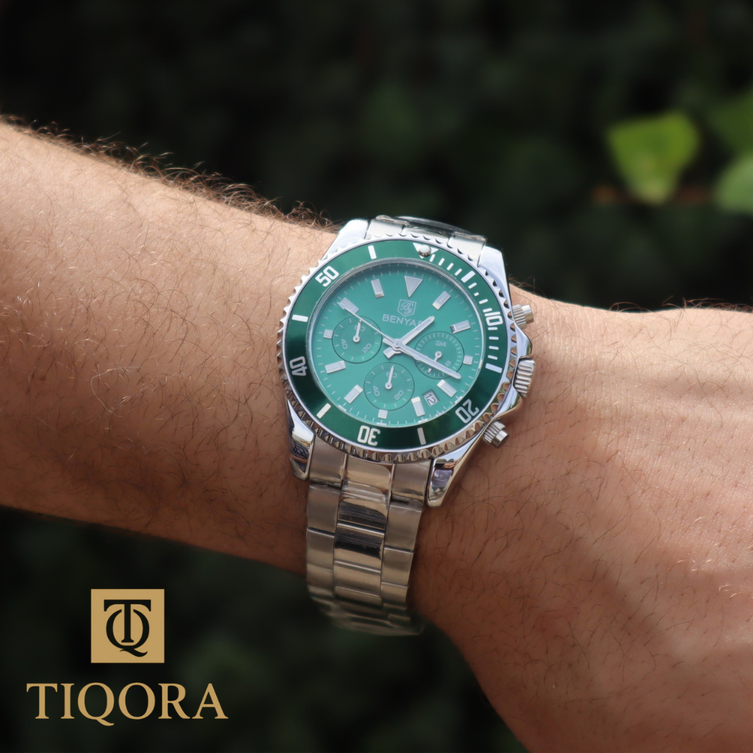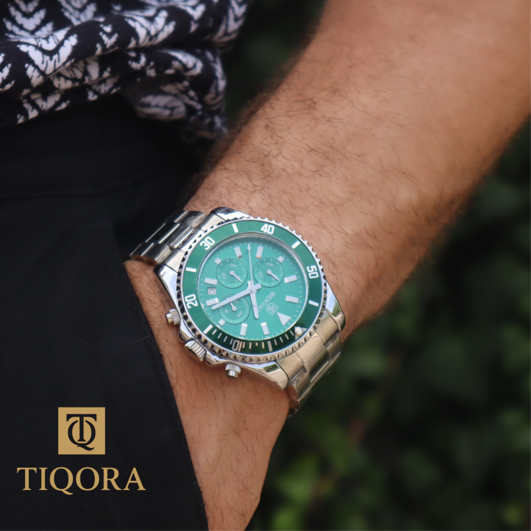 Avec son cadran vert profond et son bracelet en acier inoxydable argenté, elle apporte une touche moderne et distinguée à toutes vos tenues.
