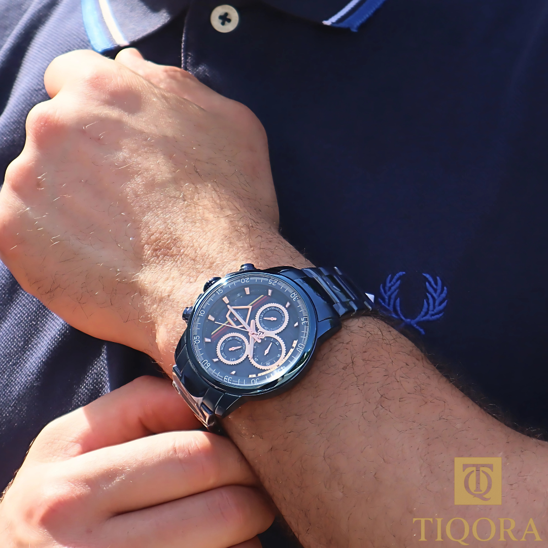 Avec son large cadran de 46 mm, son bracelet en acier inoxydable et ses finitions noir profond, elle impose un style à la fois professionnel et sportif.
